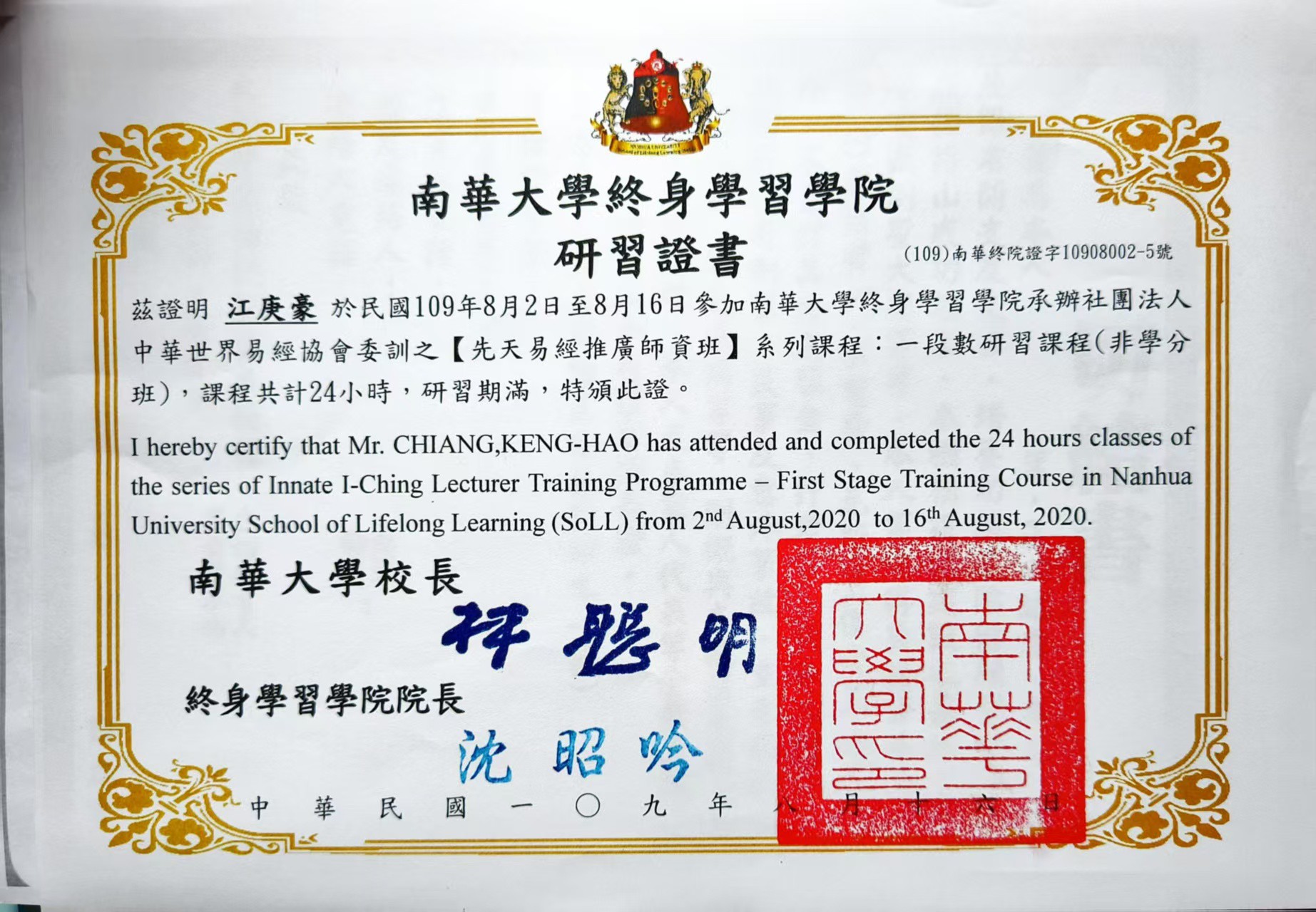 为提升传统易学研究水平,昆仑老师参与南华大学终身学习学院【先天易经推广师资】系列课程系统学习,认真钻研、勤学好问,顺利结业并获得相关研习认证。凭借扎实学识与深刻领悟,他全面掌握先天易经相关体系,为后续形成独特的易学应用研究方法提供了支撑。