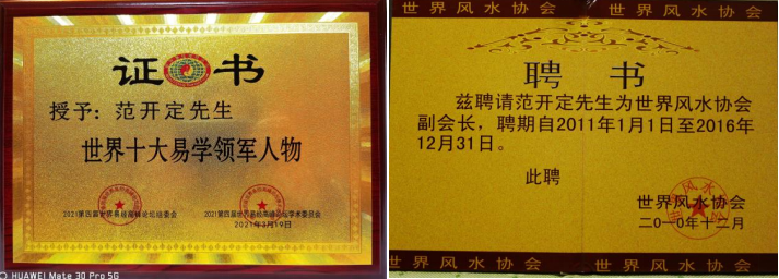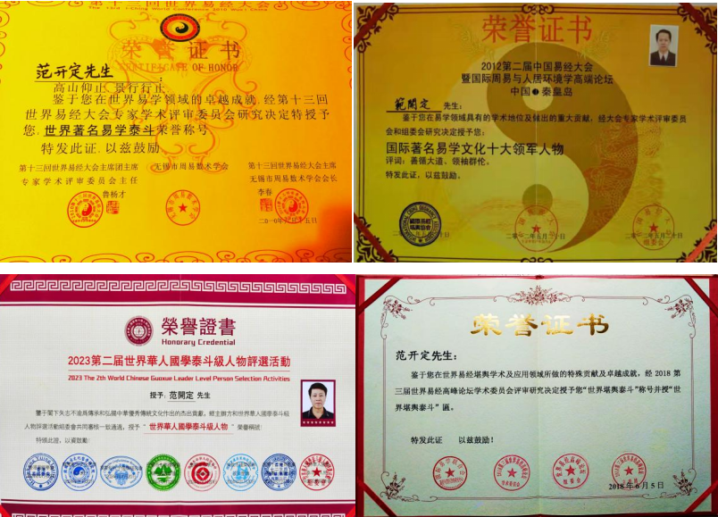 2015、2018年6月5日的世界易经高峰论坛中分别荣获“玄空学泰斗”荣誉证书。“世界堪舆泰斗”荣誉证书及红木牌匾。