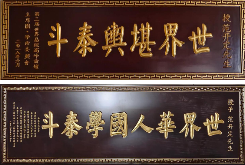 2024年元月20日被香港易经学会等7家世界华人国学权威组成的世界华人国学泰斗级人物评选活动组委会授予“世界华人国学泰斗级人物”红木大牌匾和荣誉证书。