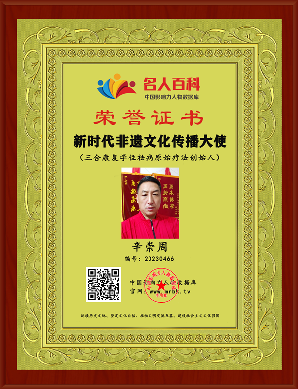 辛崇周,1969年出生,山东莒县人,中医康复理疗师三合康复穴位祛病原始疗法创始人,1998年前往新加坡求学跟随道家、佛家老师学习医术二十余年。2020年返回中国,在家乡开设了三合康复理疗店,得到了大家的一致认可。2022年,他的“三合康复学位祛病原始疗法”通过了国家版权局的审核认证,成为了一项受保护的专利技术,他本人亦获得了由国家原卫生部副部长孙隆椿部长亲笔题词的“弘扬中医国粹”牌匾,2023年担任中国中医药信息学会特新分会特邀专家,颁发牌匾和聘书。