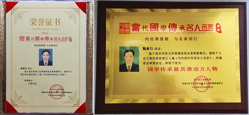 · 2024年8月被入篇《当代国学传承名人名家》,并被授予“国学传承最具推动力人物”