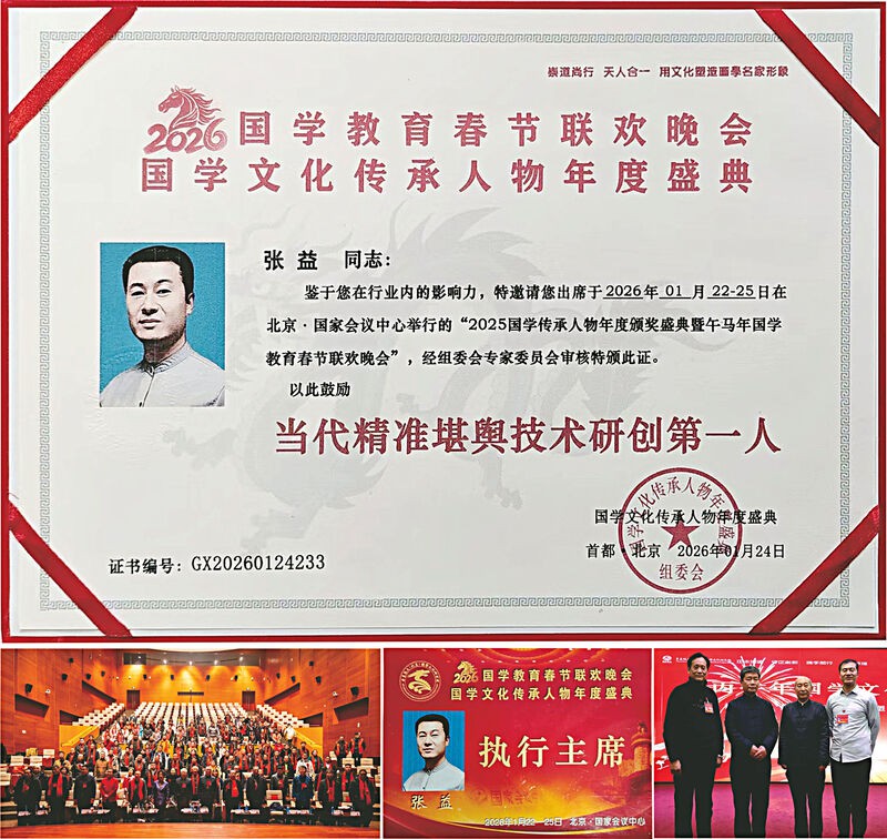 因张益老师在“精准堪舆”领域作出的突出贡献和行业内影响力,2026年1月国家会议中心“国学文化传承人物年度盛典”大会上,被与会的易学专家组委会共同审核,评为当代风水“精准堪舆技朮”研创第一人,同时被授予“大会执行主席”职务。