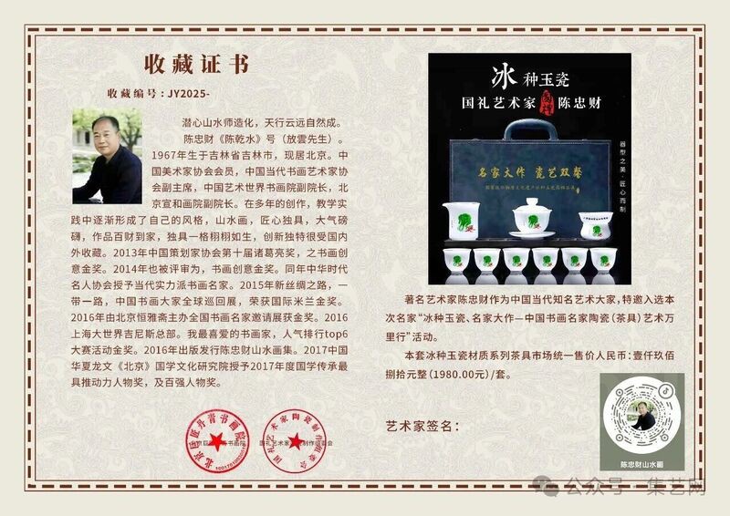 陈忠财老师的书画作品被巨匠丹青书画院、国礼艺术家陶瓷制作组委会和德化瓷厂出品的“冰种玉瓷、大家风范--中国当代艺术名家陶瓷(茶具)艺术万里行”活动选用,已制作完成投放市场。